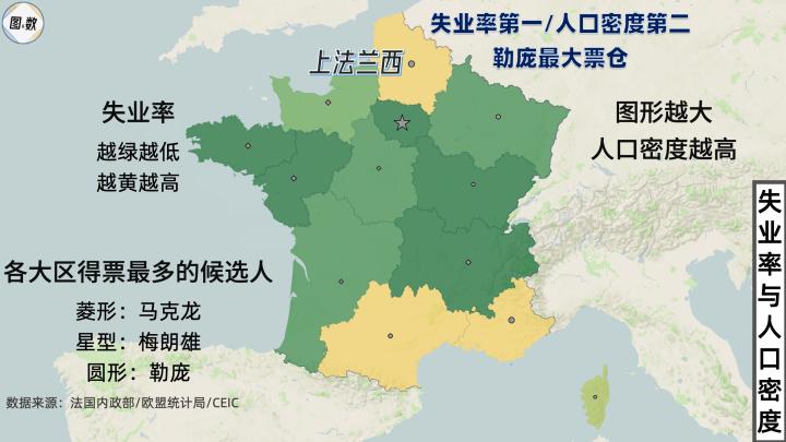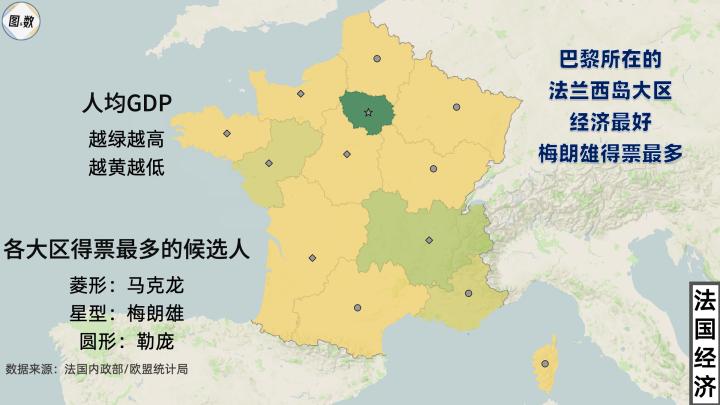 法国经济最好的地区是首都巴黎所在的法兰西岛大区,2018年人均GDP约为5.97万欧元,勒庞在这里的影响不大,“不屈法国”的领导人梅朗雄在这里收获了最多的选票,甚至比现任总统马克龙还要多一些。