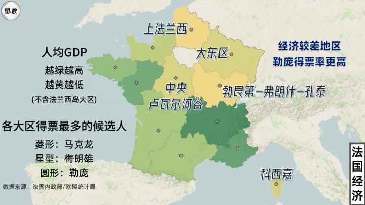 而在法国经济排名后5位的大区,除中央-卢瓦尔河谷更青睐马克龙之外,与比利时接壤的上法兰西、与德国接壤的大东区、与瑞士接壤的勃艮第-弗朗什-孔泰大区以及与意大利接壤的普罗旺斯-阿尔卑斯-蔚蓝海岸大区中得票率最高的候选人都是勒庞。
