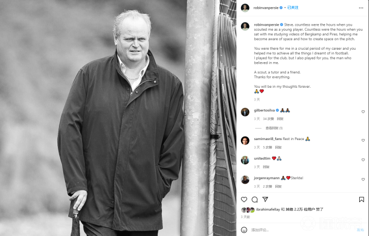 笔者当时认为,范佩西应该不会发表任何文字来表达对伯乐的哀思了,因为当时已经18号了,包括小法、托尼-亚当斯、帕洛尔、卡巴斯扬等前阿森纳球员均在第一时间在社交媒体发表了对于罗利的感谢和想念。其他人都发完一天了,范佩西的官方推特和INS账号依旧没有任何声音。
