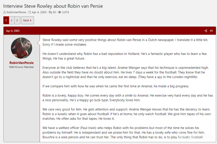 “温格知道他有足够强烈的上进心。而当我们谈到足球时,范佩西便会像疯子一般狂热。如果他在家,他只看足球,他经常问我们要自己比赛的录像带,他非常喜欢看。我们还有一位福利官员保罗-欧文(Paul Irwin)来帮助他解决生活的问题,但大多数时候他都能自己解决问题。此外,范佩西还有一位可爱的妻子布切拉,对他照顾的很好。”