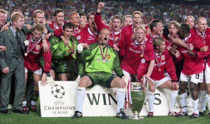 曼联身穿胸前印有“SHARP”名称的球衣,夺得99年欧洲冠军杯