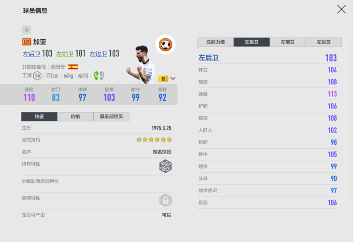 这样一位优秀的球员在游戏里竟然没有一个优秀的赛季卡,属实让人比较意外,最高能力值是已经绝版很久的19U赛季卡,单卡能力值94。相比较没绝版的HOT赛季卡来说,这张E21加亚属性相近,而且14工资对于西班牙队套来说还是很香的,毕竟前场有托雷斯、莫伦特斯等占据一定工资的顶级前锋,而加亚虽然数据一点都不起眼,但游戏里用过之后却出人意料地惊喜:回防速度很快,尽管只有速度属性超过了120,但跑动能力不亚于对手130多速度的边锋;进攻端的传中还是有准度的,唯一的缺点在于模型太小以及稳定性不足,缺低工资边后卫的队套可以使用。