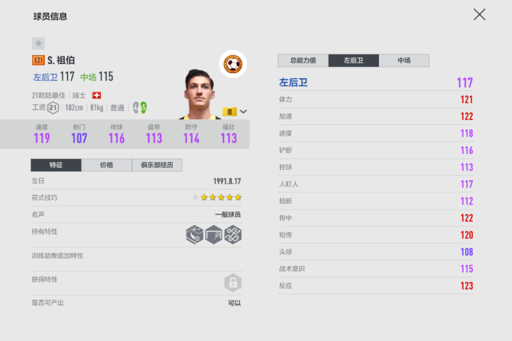 在游戏里,这张E21赛季祖伯的位置是左后卫,不过在边前卫位置的总评是同样高的。受限于户口,可以说他的这张卡是相当冷门,只有瑞士队套或者E21赛季套玩家会使用,但相信用过的小伙伴都会对这种卡有比较深的印象,因为他的实战表现非常活跃,攻能够插上到对手大禁区附近完成一脚高质量传中,守能够利用边后卫里突出的模型和强壮属性来完成强硬的卡身位抢断。当然,他的手感比起顶级球员还是有所差距,特别是在转身控球那一下,能明显感受到一些僵硬,不过好在他的传中、搓射高手特性都能够帮助他在进攻端有所收获,这样一位“带刀后卫”相信也会受到队套玩家的青睐。