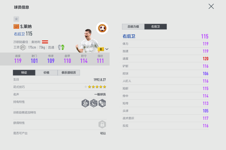 游戏里门兴队套其实也算是小众队套里的强势队套了,特别是有图拉姆、恩博洛、扎卡利亚等诸多实用球员以及马特乌斯、埃芬博格等巨星,综合实力并不逊色。E21赛季莱纳可以说是球队防线最稳定的一环,双速、体力均接近130,相关防守属性均在125以上,更重要的是,他有着快速带球特性,对于一名边路球员来说是至关重要的,这也意味着他在进攻端的表现能够得到保障,较高的站位属性也使他能够在球队组织进攻的时候利用对手防线空当选择插上完成下底传中。当然,他的防守意识在实战中不算特别突出,特别是拦截对抗的时候很难从对手身上取得优势,但速度往往能够帮助他更先一步获得身位优势。