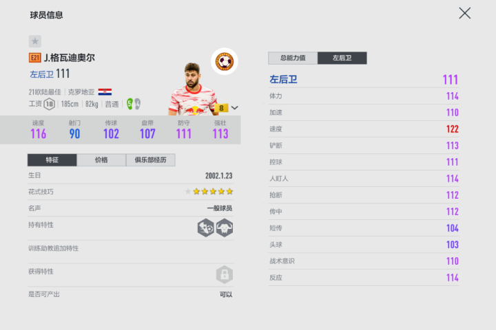 克罗地亚中卫格瓦迪奥尔毫无疑问是德甲潜力最高的几名妖人后卫之一,有着中卫身材的他却有边后卫的速度,在球队打过边后卫也打过中卫,展现出了很稳定的出球能力。