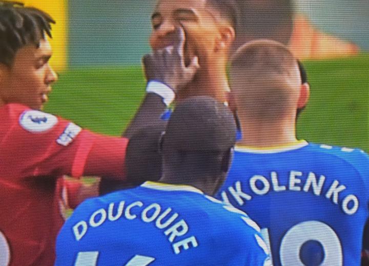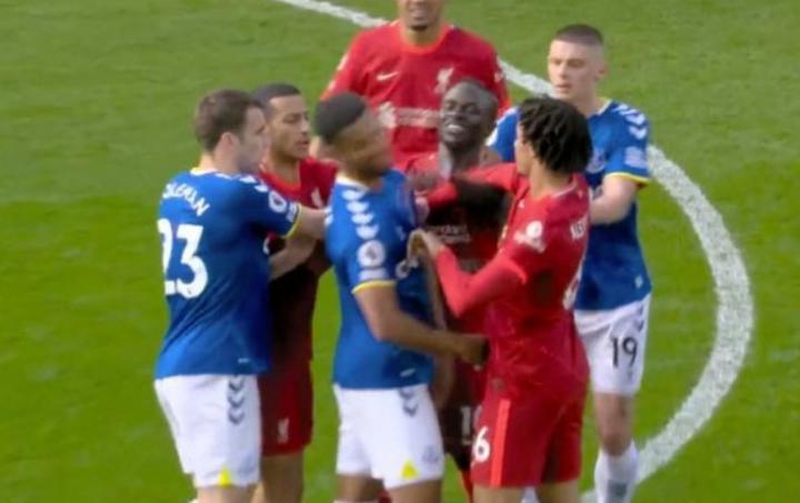 除了点球的争议,在上半场的比赛末段,双方还爆发了一次较大规模的冲突。当时埃弗顿前锋里沙利松倒地,而利物浦球员并未停止进攻,随后杜库雷对法比尼奥犯规引发双方冲突,马内还在冲突中故意戳到了对方球员的脸,一番“混战”之后,马内与杜库雷各得一张黄牌。