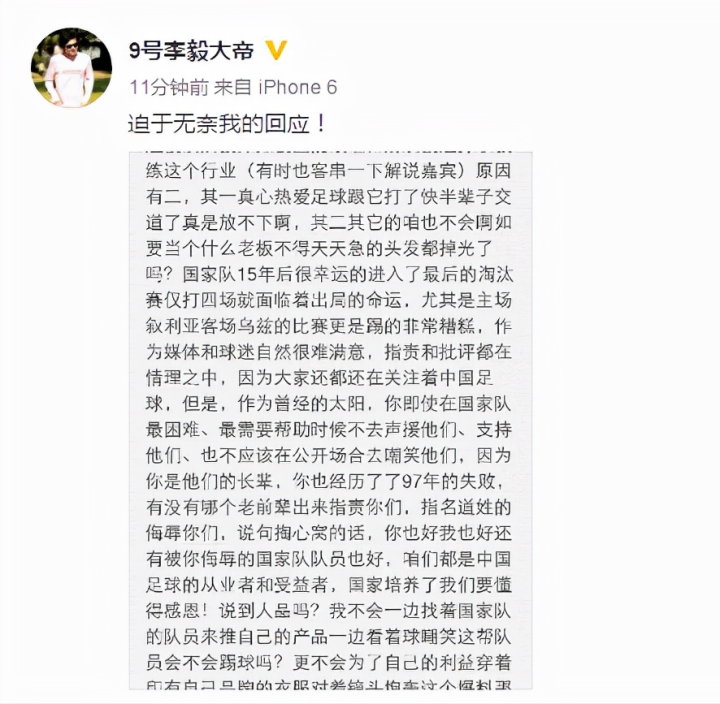 “有人说我是球霸,我不知道从哪来的。这个词难道不是说的是某位大帝?大家知道李毅为什么在合同没完就离开球队?是被球队撵走的,被主教练、俱乐部给撵走的!”