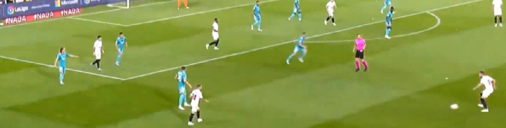 相比之下依旧在后卫线上布置5个人着实有点浪费。所以在阵型上我更希望摒弃4中场阵型重新启用4-3-3。特别是巴尔韦德的防守位置感不佳的情况下,由罗德里戈阶段性落位到后卫线,固定住巴尔韦德右中场的位置,通过减少中场的轮转换位次数来稳固中路防守。