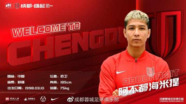 成都蓉城官方宣布,阿不都海米提加盟球队。