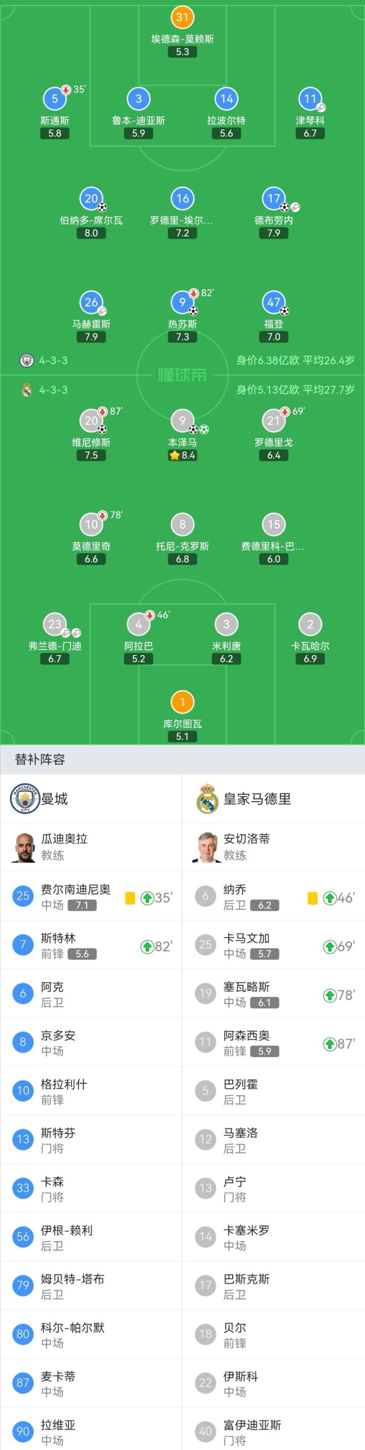 曼城首发:31-埃德森-莫赖斯、11-津琴科、14-拉波尔特、3-鲁本-迪亚斯、5-斯通斯(35'25-费尔南迪尼奥)、16-罗德里-埃尔南德斯、20-伯纳多-席尔瓦、17-德布劳内、26-马赫雷斯、47-福登、9-热苏斯(82'7-斯特林)