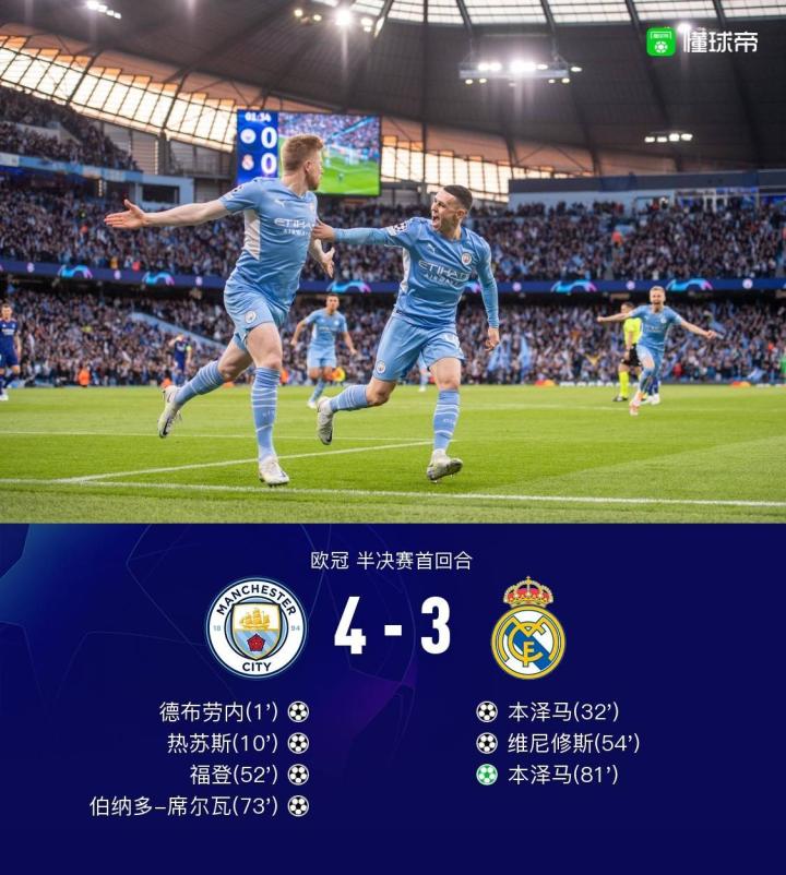 北京时间4月27日03:00,欧冠半决赛首回合展开巅峰对决,曼城坐镇主场迎战皇家马德里。上半场,德布劳内开场1分33秒俯身头槌闪击后又助攻热苏斯破门扩大优势,本泽马凌空扫射为皇马扳回一城,马赫雷斯与福登各失良机。下半场,福登头球建功,维尼修斯一条龙奔袭破门,B席爆射得手;随后拉波尔特手球送点,本泽马勺子点球破网完成双响。最终,曼城主场4-3力克皇马,占晋级先机。