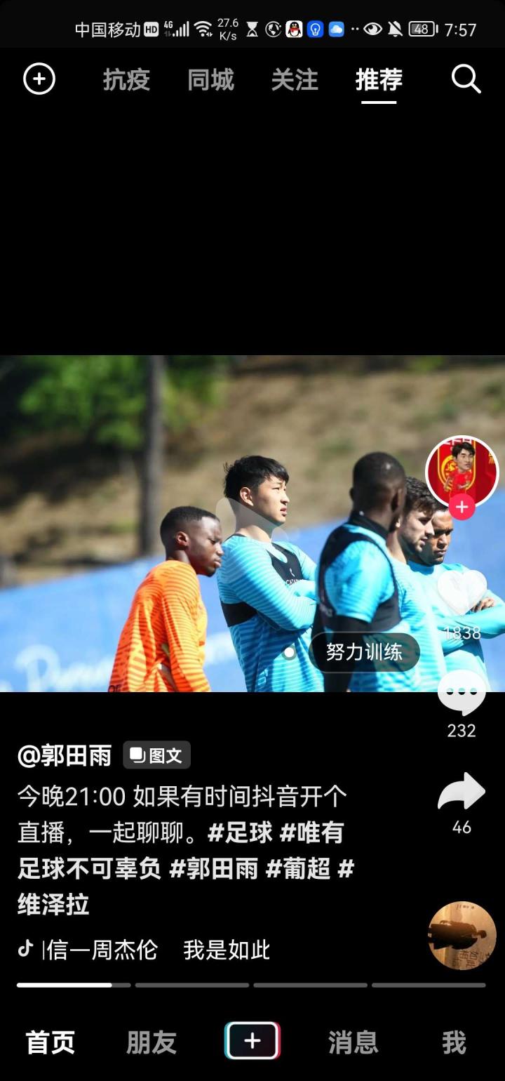 留洋葡超中国球员郭田雨也将在抖音直播 是不是戴琳带起来的[绿帽狗头]