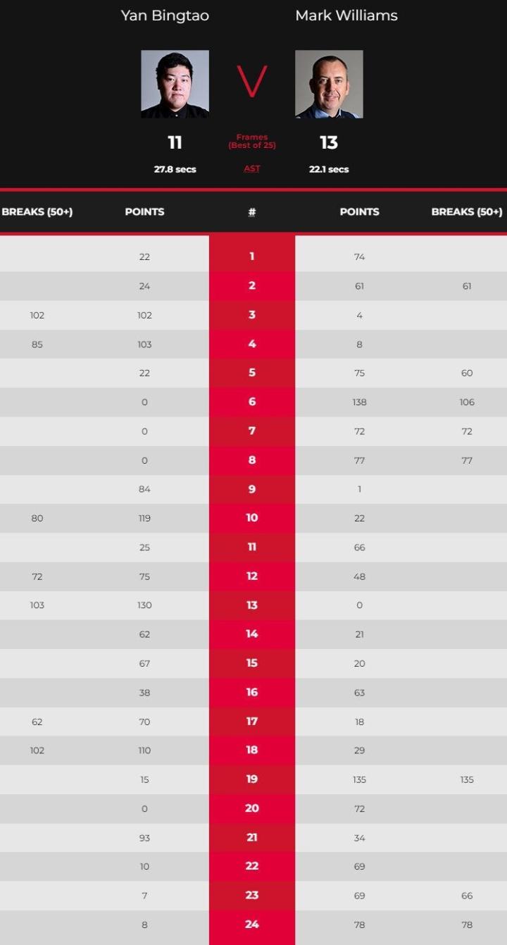 本场比赛进行得异常焦灼,颜丙涛在前八局一度2-6落后,但随后连扳多局,将局分反超为8-7,两人随后8-8、10-10、11-11三度战平,最后两局马克-威廉姆斯抓住机会再下两城,总比分13-11淘汰颜丙涛,晋级四强,至此本届世锦赛已无中国选手身影。