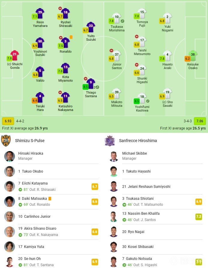 本场清水和上轮联赛相比做出了两个位置的调整。白崎凌兵首发出战,顶替了后藤优介,打在左边前卫位置;蒂亚戈-桑塔纳顶替吴世勋,和铃木唯人搭档双前锋;中前卫组合依旧是罗纳尔多和宫本航汰。