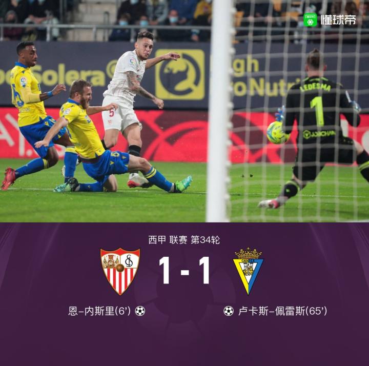 北京时间4月30日3:00,西甲第34轮,塞维利亚主场对阵加的斯。上半场,拉基蒂奇助攻恩-内斯里头球破门,拉梅拉远射被没收,戈麦斯远射被扑出。下半场,卢卡斯-佩雷斯任意球破门,迭戈-卡洛斯抽射被没收,最终,塞维利亚1-1加的斯。