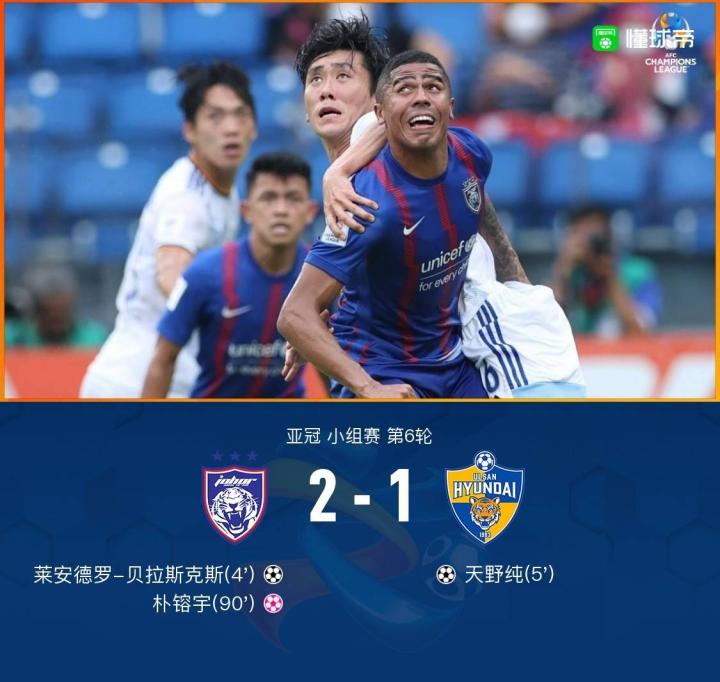 北京时间4月30日17:00,亚冠小组赛第6轮,柔佛新山对阵蔚山现代。上半场,刚开场不久贝拉斯克斯就任意球圆月弯刀直钻死角打破僵局,但紧接着天野纯就帮助蔚山扳平比分;下半场,双方都没有更多进球的好机会,但补时阶段朴镕宇不慎自摆乌龙,最终柔佛新山2-1绝杀蔚山现代。