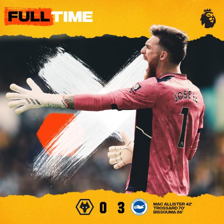 第41分钟,布莱顿快发任意球,维尔贝克在博利的防守下倒地,裁判再次判罚点球。麦卡利斯特这次把握住机会,我狼0-1落后。