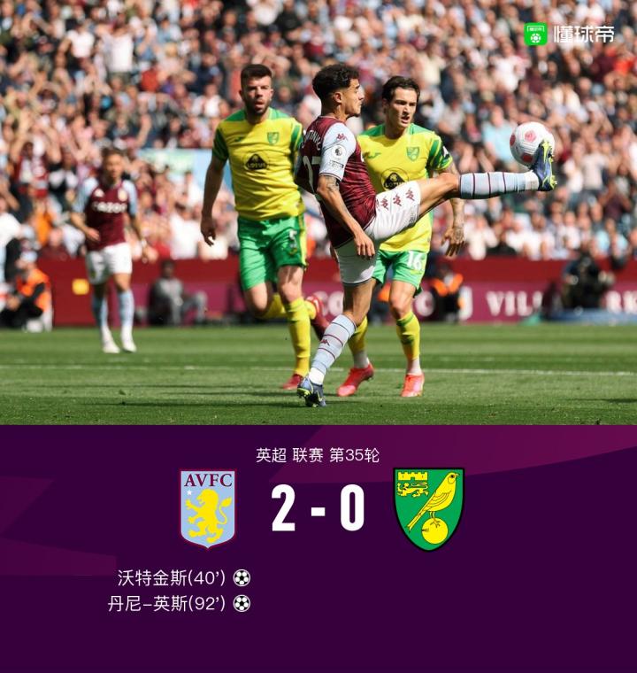 北京时间4月30日22:00,英超第35轮,阿斯顿维拉主场对阵诺维奇。上半场,沃特金斯抢射打高,利昂-贝利远射中框,拉希察内切远射被扑出,沃特金斯打破僵局。下半场,丹尼-英斯头球中框,阿伦斯抽射打偏,丹尼-英斯比赛结束前锁定胜局,最终,维拉2-0诺维奇。