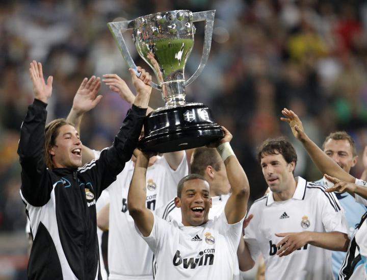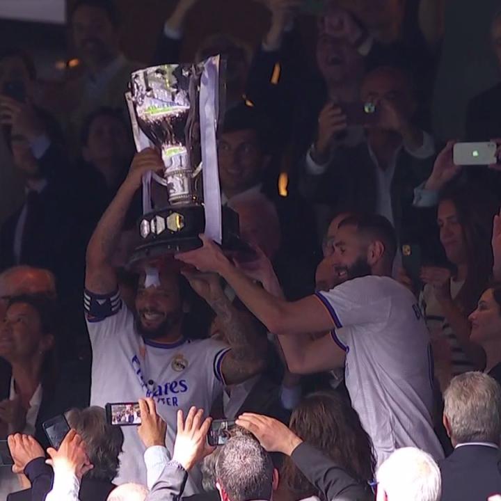 颁奖仪式上,队长马塞洛在看台上与本泽马一起高高举起象征西甲最高荣誉的冠军奖杯。