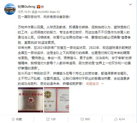 后仰上篮北京时间5月1日,广东男篮主帅杜锋更新社媒,晒出了两张《全国五一劳动奖状》的图片(广东男篮荣获,杜锋作为代表接受表彰),并发布长文。