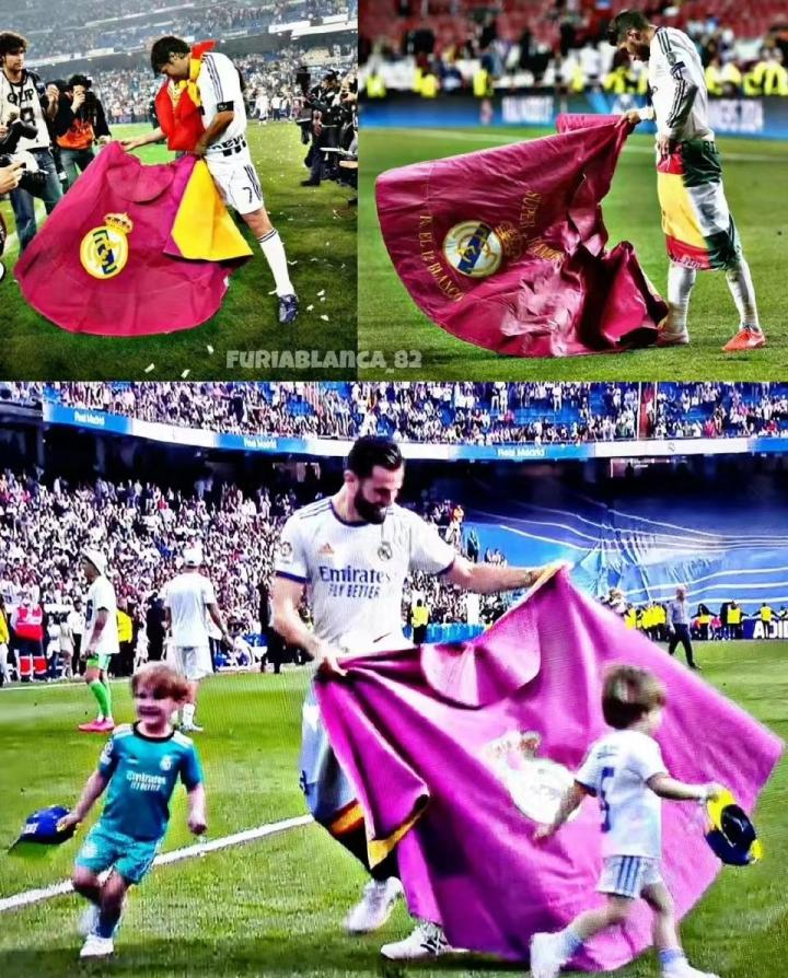 因为国内转播的缘故,大家很多人没有看到曾经的固定项目,老队长劳尔和拉莫斯挥舞斗牛旗,大家也都在猜想会是谁成为下一位挥舞它的人呢,不出意外是纳乔,当然也有个小插曲,他的两个孩子不小心撞了车,还是有那么些不熟练,毫无疑问我觉得队内的西班牙球员里,纳乔最有资格成为挥舞斗牛旗的人,他默默无闻捍卫着这身白衣,曾经他也因为比赛机会少想转会,有机会远走亚平宁加盟罗马,最后他选择了留守,甘愿当替补,但皇马真的缺不了他,那幅“Nacho is here”的图片想必大家不会陌生,他可以打后防线的每一个位置,尽管不顶尖但也足够优秀,客场对阵塞维利亚也证实依靠刚登场的纳乔的进球才将比分比分扳平,谢谢一直以来的付出,希望纳乔能在皇马退役。希望这赛季还有机会再挥舞一次斗牛旗!