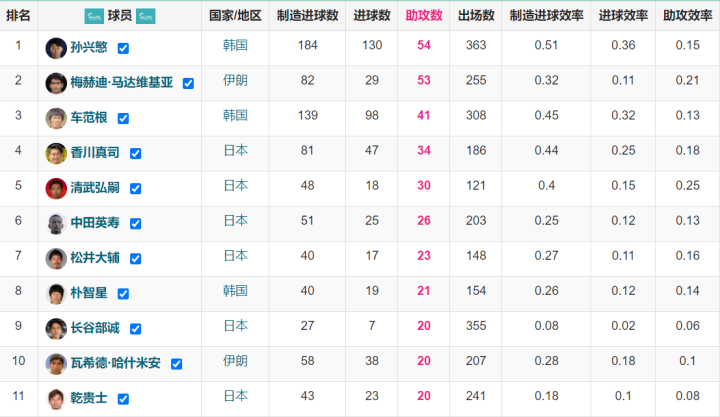 孙兴慜超越马达维基亚成五大联赛亚洲助攻王,前十都有谁?