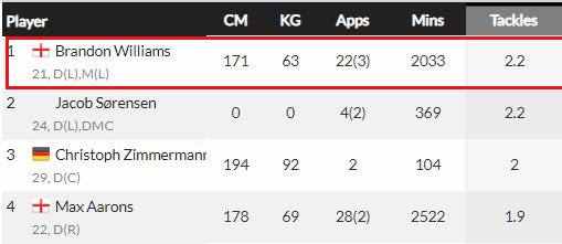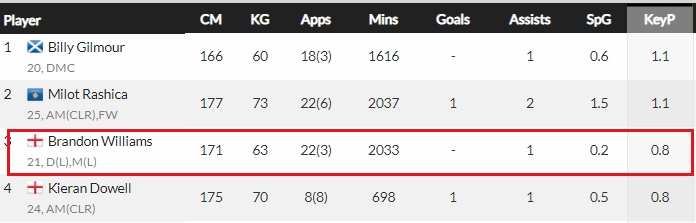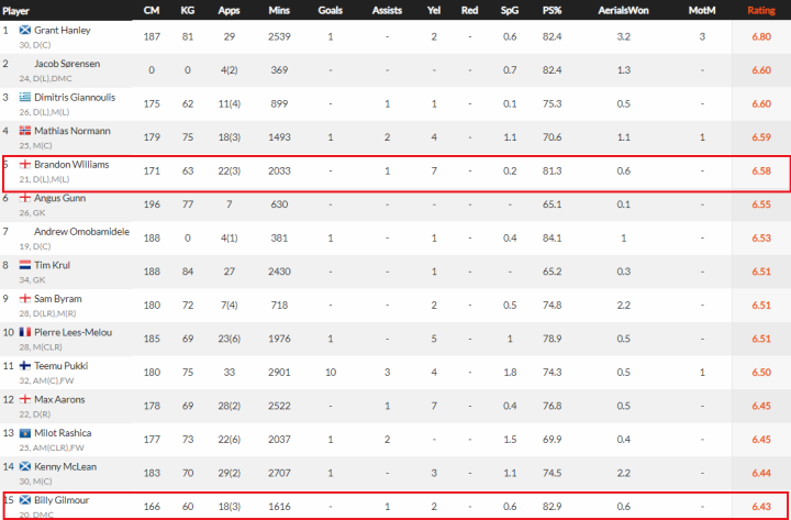 请大家关注这张图最后一列(Rating),whoscored本赛季诺维奇全员的比赛平均分。诺维奇中后卫格兰特-汉利表现最佳,但全队没有人能达到whoscored的良好标准(>7分)。B威位列第5,在出场1000分以上的球员中位列第3,算是球队可靠的选择。同样值得关注的是吉尔摩的表现,只有6.43分,位列第15,可以说两位豪门潜力股,虽然位置不同,至少在评分上B威稍有优势。