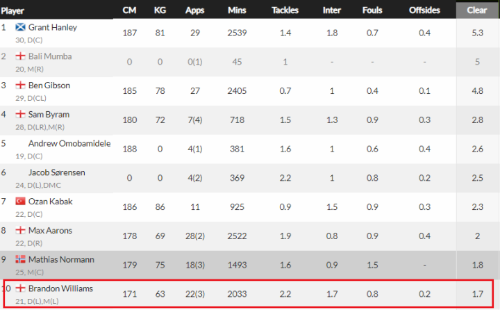 本赛季,诺维奇主帅不在乎帮豪门练小妖,切尔西的吉尔摩也在此培训。如今诺维奇惨淡降级,但B威可以说是后防线最稳定的一环,下面我将B威本赛季数据与诺维奇队友对比,与英超联赛里相同位置的精英对比,还将和曼联现有左后卫人选进行对比: