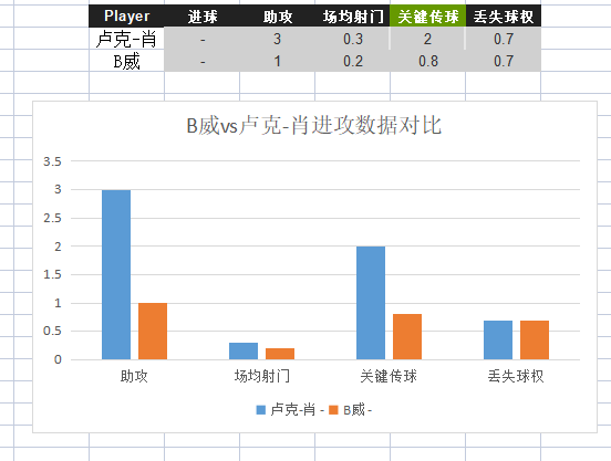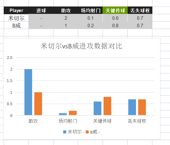 在进攻数据方面,两人的进球助攻都不多,因为水晶宫和诺维奇都是喜欢蜗居后场。关键传球B威稍微领先,两名球员丢失球权次数都不多。由此看出B威在进攻方面有一定的特点,胆大心细。
