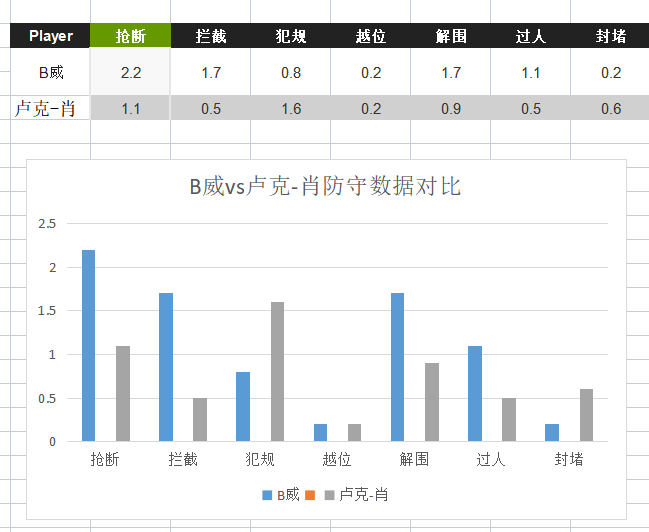 为了清晰对照,我对他们的防守数据做了一张图。在抢断数据上,米切尔堪称变态。两名球员犯规数都不多,解围方面,米切尔也更胜一筹。而B威过人数据几乎是米切尔的两倍,可以看出作为一个边后卫,B威更具进攻心态。