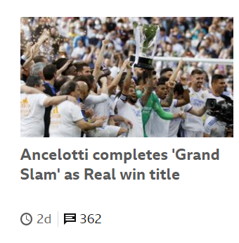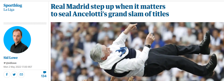 在翻译之前,先说一个表达,安切洛蒂“大满贯”如何表达?很多媒体都将其表述为“grand slam”(如下面的卫报和BBC)。grand slam:If someone wins a grand slam, they win all the major tournaments in a season in a particular sport, for example in golf or tennis. slam一词原表“摔打”,因此根据grand slam的另一个释义,其可能来源于棒球的 “全垒打”: In baseball, a grand slam is a home run that is hit when there are players standing at all of the bases.