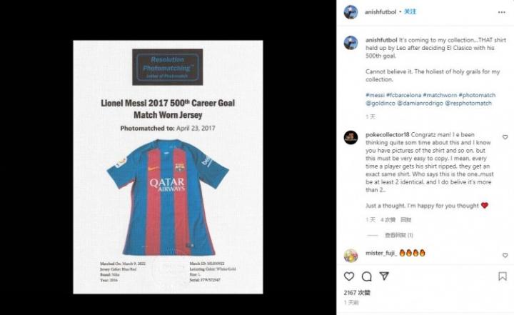 Anish在社媒上写道:“真的不敢相信,这是我最为神圣的收藏品。” 他还出示了这件球衣是真品的证书。