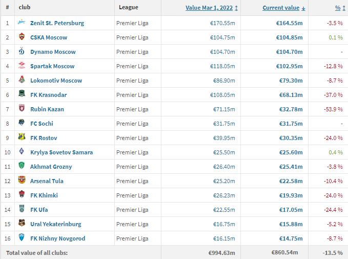 平均来看,尽管各大俱乐部已经对于“外援逃离”做了两手准备,但俄超所面临的损失仍不可小觑。根据数据,相比于3月初,如今俄超联赛球队的身价平均缩水达到了13.5%,身价跌幅最多的是喀山红宝石,达到了53.9%。