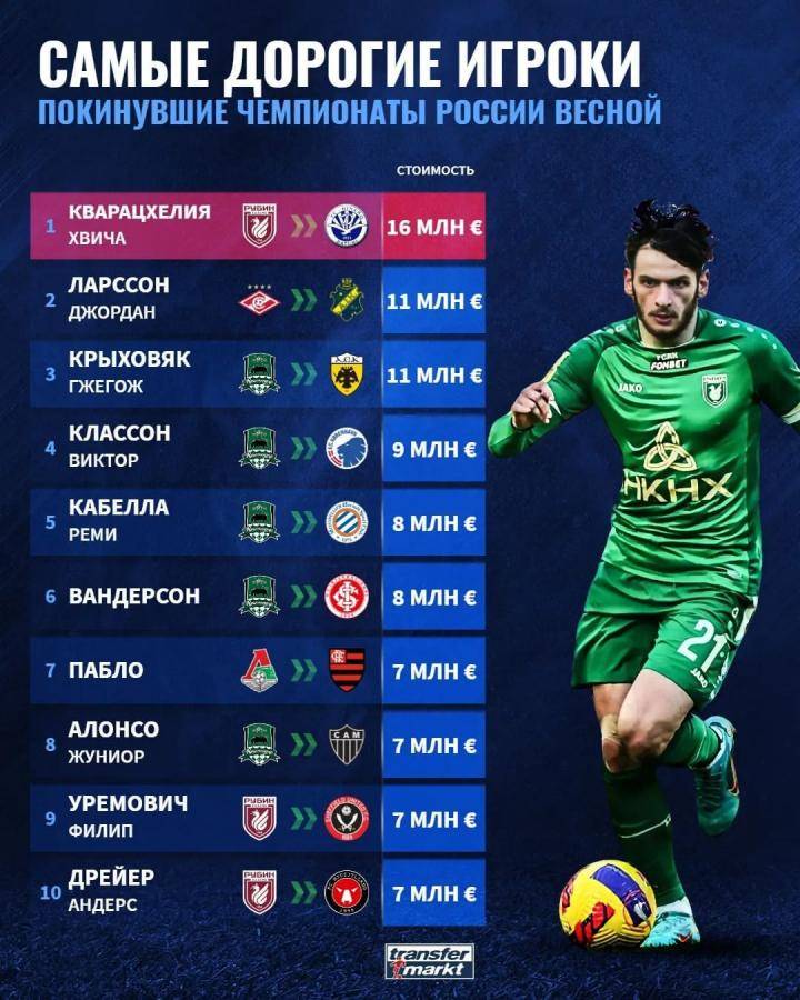 根据德国转会市场俄语区统计,俄乌战争爆发后离开俄超的十名身价最高的球员分别是克瓦拉茨赫利亚(巴统迪纳摩)、拉尔松(AIK索尔纳)、克雷霍维亚克(AEK雅典)、克拉松(哥本哈根)、卡贝拉(蒙彼利埃)、万德松(巴西国际)、帕布洛(弗拉门戈)、阿隆索(米内罗竞技)、乌雷莫维奇(谢菲尔德联)、德雷尔(中日德兰)。