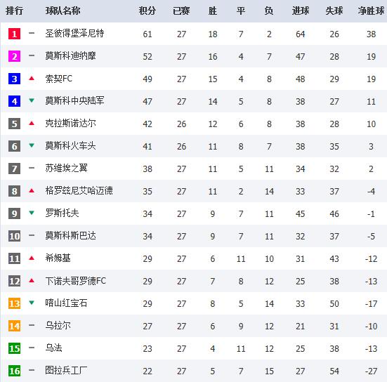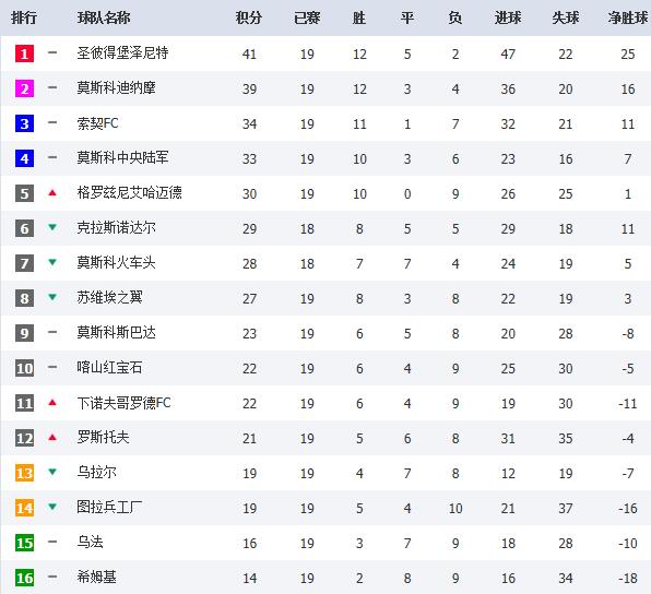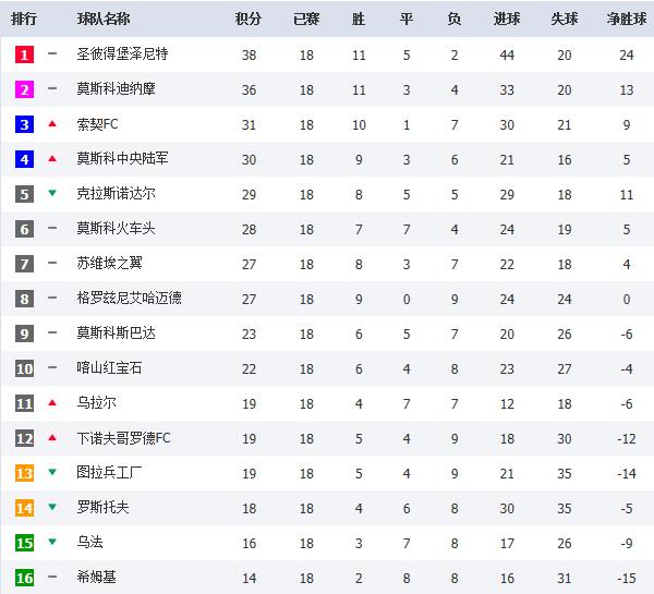 18轮结束后,俄超积分榜