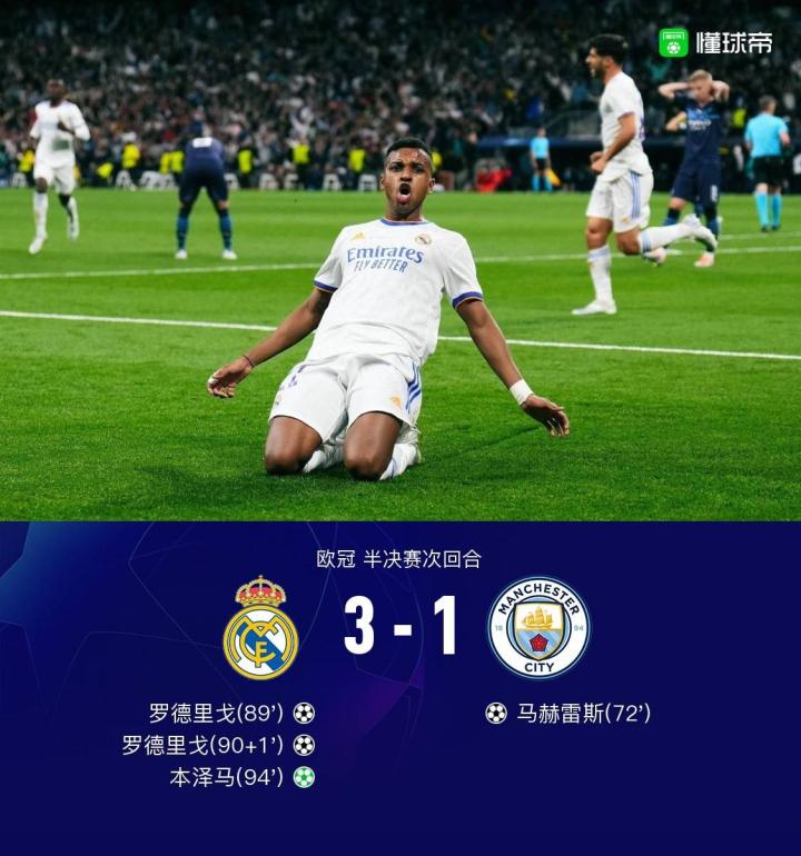 第90+1分钟,伯纳乌奇迹!卡瓦哈尔右路传中精确制导,阿森西奥头球一蹭,罗德里戈头球接力破门上演梅开二度力挽狂澜一战封神,皇马89秒连入两球2-1反超,将总比分瞬间扳成5-5平!
