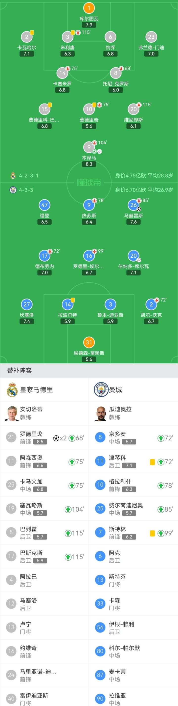 皇家马德里首发:1-库尔图瓦、2-卡瓦哈尔、3-米利唐(114'5-巴列霍)、6-纳乔、23-弗兰德-门迪、14-卡塞米罗(74'11-阿森西奥)、8-托尼-克罗斯(67'21-罗德里戈)、10-莫德里奇(74'25-卡马文加)、15-费德里科-巴尔韦德、20-维尼修斯(114'17-巴斯克斯)、9-本泽马(103'19-塞瓦略斯)