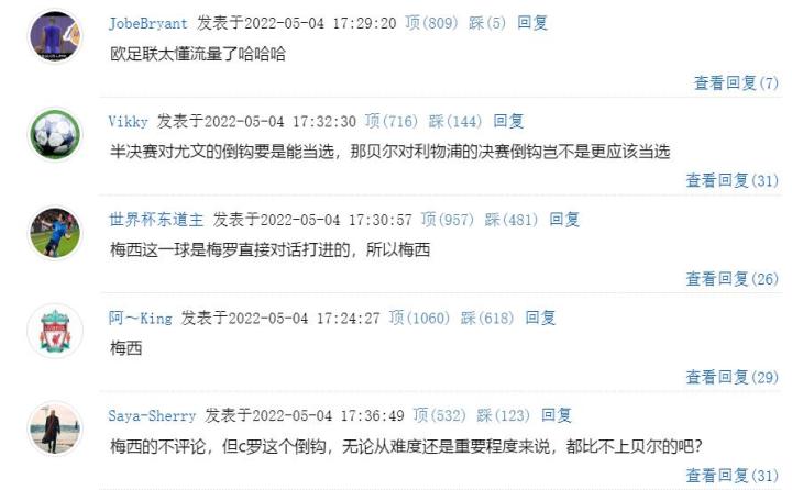 还有球迷认为,梅西的进球是在对阵C罗的比赛中打进的,所以应该直接当选冠军。这当然是调侃。不过,更多的球迷认为,如果C罗的倒钩进球当选,那贝尔在2018年欧冠决赛打入的倒钩进球算什么呢?无论是难度、精彩程度还是重要性,贝尔的倒挂金钩比C罗的倒挂金钩都更强吧。