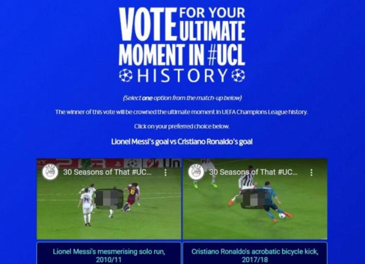 本赛季是欧洲冠军联赛改制以来第30个赛季,在欧足联官方主持的欧冠30年最佳时刻评选活动(由球迷投票评出)的半决赛中,C罗倒挂金钩击败了伊斯坦布尔奇迹,梅西一条龙击败阿诺德助攻。梅西和C罗进入了最后的决赛。