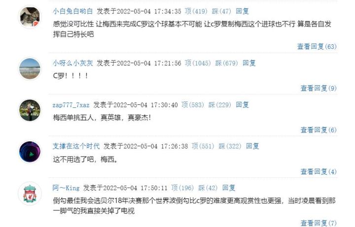 在评论区,许多球迷都认为梅西的“一条龙过人+进球”应该当选,“梅西单挑五人,真英雄,真豪杰!”也有球迷认为,这两个时刻没有可比性,让梅西来完成C罗这个进球基本不可能,让C罗复制梅西这个进球也不行。