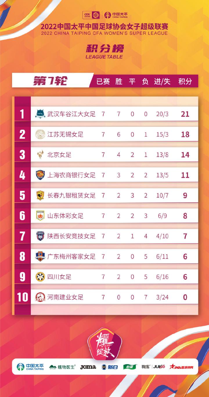 武汉车谷江大与广东梅州客家女足的对决,也产生了4个进球。不过,实力强大的武汉队由塔比莎、古雅沙、马君在第4分钟、第6分钟、第31分钟分别建功,早早锁定胜局。虽然第61分钟,梅州客家18岁小将陈竹炳在禁区外上演精彩低射破门,为球队扳回1球,但已经无力回天。此役过后,豪取7连胜的武汉队,继续强势领跑。梅州客家则2胜5负积6分,凭借净胜球优势位列第8。