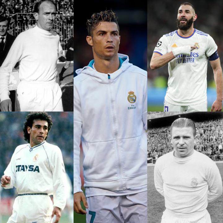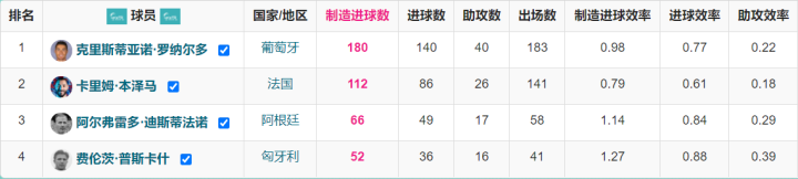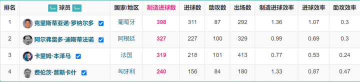 迪斯蒂法诺+普斯卡什是皇马历史上最伟大的前场组合,只不过他俩合作时年龄都有点大了,1958年时迪斯蒂法诺32岁、普斯卡什31岁。1960年欧冠决赛皇马对阵法兰克福,34岁的“金箭头”上演帽子戏法、33岁的“金左脚”更是上演大四喜。现在想想,本泽马+C罗就是2010年代皇马的“迪普组合”啊,本泽马类似迪斯蒂法诺擅于组织且进攻也很强,C罗位置则更靠近禁区更多去完成终结类似普斯卡什,虽然迪斯蒂法诺作为前场自由人,他的活动范围、回撤深度和中场拿球组织频率要高于本泽马,但两人的作用还是有相似之处的。 最后奉上这四人的欧冠和西甲数据: 欧冠:C罗183场140球40助攻、本泽马141场86球26助攻、迪斯蒂法诺58场49球17助攻、普斯卡什41场36球16助攻。 西甲:C罗292场311球87助攻、本泽马413场218球101助攻、迪斯蒂法诺329场227球100助攻、普斯卡什180场156球84助攻。(迪斯蒂法诺和普斯卡什助攻数据来源国外大神通过旧报纸历史战报统计)