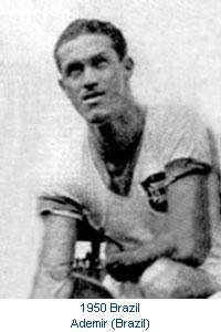 1950年世界杯,巴西在家门口输给了乌拉圭,他们唯一的收获是阿德米尔,世界杯的最佳射手。在那届大赛上,阿德米尔个人打进了9个进球,是巴西队的最大亮点。阿德米尔出生于1922年11月8日,代表巴西队参加过39场比赛,打进32球,是贝利之前与莱昂尼达斯等人齐名的射手。