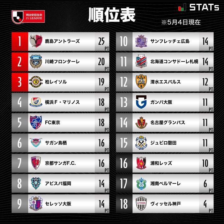 最终,鹿岛鹿角主场3-1击败磐田喜悦,继续坐稳积分榜头名。
