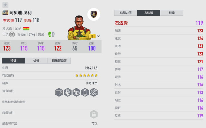 前加纳著名足球运动员阿贝迪·贝利曾长年在欧洲五大联赛效力,在里昂、马赛、里尔等球队里均有着不错表现,特别是1993年帮助马赛夺得欧冠冠军,这是其职业生涯最辉煌的时刻,同时两度获得非洲足球先生也足以说明其实力。 游戏里HR阿贝迪·贝利也是一张实用性不错的优秀边锋,对于所属的俱乐部套来说,能起到很好的补充作用。阿贝迪的手感舒适,控制起来轻盈,拿球也灵活,可以尝试边路的1V1突破;阿贝迪突破后可以选择内切,晃开空间的搓射是他的绝活;除了射门能力强,阿贝迪的传球也很靠谱,逆足是4,但是也能送出一脚直塞和横传,而顺足的传中精度更值得信赖;阿贝迪的缺点是对抗有点薄弱,需要减少身体接触。总的来说瑕不掩瑜,HR阿贝迪·贝利能够成为非热门套装的重要球员,帮助玩家们在进攻端建立优势。