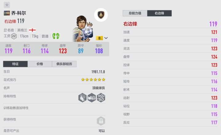 “蓝军”切尔西的传奇名宿乔.科尔,是英格兰历史上著名的超级边锋,以出众的盘带和精准的助攻能力闻名于世。乔科尔职业生涯三次捧起英超冠军奖杯,曾入围PFA年度最佳阵容,多次在球队困难时刻站出来力挽狂澜。 22HR乔.科尔在之前的EACC比赛里有着突出表现,得到了许多观赛玩家的认可。这张科尔的手感一如既往细腻,对喜欢盘带过人的玩家来说,是如鱼得水;他可以在两侧区域里闪转腾挪进行突破,面对围抢也可以将球送出来,是很有威胁的边路进攻发起点。HR和大使赛季相同,都是55脚,可以顺势不调整传射,这也是他受到高手青睐的原因之一。科尔有着很准的搓射精度,特别是接近弧顶的位置,有空间就能起脚射远角,成功率颇高;当他在禁区内接球后,果断打一脚大力DD也是值得尝试的选择。虽然科尔的体型不算健壮,不过对局里能发现,他的身体耐抗性不错,往往能保持住平衡和对球的控制。22HR乔科尔是切尔西和利物浦套良好的补充,相信能为朋友们带来新的体验,想入手新边锋的玩家可以试试。