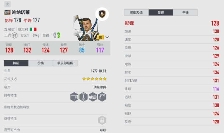 被誉为意甲最伟大的前锋之一的迪纳塔莱,有着超越常人的速度和比赛创造力,人送外号“迪神”。迪纳塔莱曾获得意甲金靴和意大利足球先生,为乌迪内斯队贡献了非常重要的力量,是队史的传奇队长之一。 游戏里的迪纳塔莱定位是影锋和中锋,不过体验后发现,他在中路容易受限于模型,不易发挥自身优势,因此更建议出任边锋。HR迪纳塔莱的跑动非常积极,即使放在边路一侧,也能突然前插冲击边后卫和中后卫的结合部,打对手一个措手不及;迪纳塔莱的爆发力强,可以瞬间起速甩开后卫,还可以用QE弹射等技巧突进;传球和射门是迪纳塔莱的两个优势,顺足脚右脚的发力足,大力抽射和搓射精度没问题,传中以及ZS传球也能保证成功率;HR迪纳塔莱的手感轻盈,可以实现连续的变向过人,如果玩家的微操技术不错,可以多用他来进行边路爆破。对于乌迪内斯套玩家而言,HR迪纳塔莱的游戏可玩性和情怀性都很高,非常推荐入手使用。