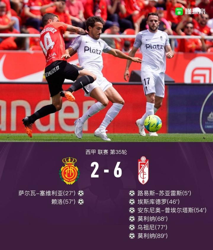 北京时间5月7日20:00,西甲第35轮比赛,马略卡与格拉纳达上演一场保级关键战。上半场,苏亚雷斯的进球帮助格拉纳达取得梦幻开局,随后塞维利亚远射扳平比分,赖洛在半场最后时刻破门但越位被吹;下半场,埃斯库德罗闪击得手,替补登场的莫利纳助攻普埃尔塔斯破门后自己也取得进球,赖洛为主队扳回一球,但乌祖尼也取得进球,莫利纳最后时刻完成梅开二度,最终格拉纳达6-2马略卡。此役过后,格拉纳达暂时脱离降级区,马略卡则跌入降级区。