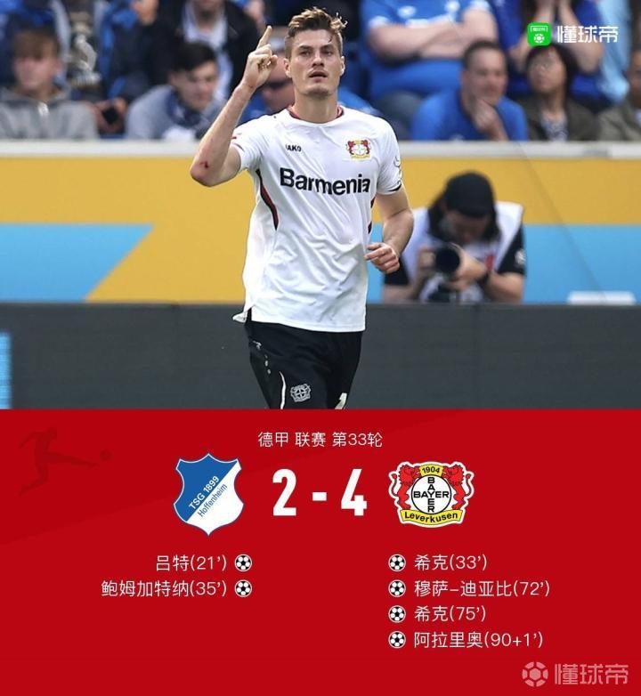 北京时间5月7日21:30,德甲第33轮比赛,霍芬海姆对阵勒沃库森。上半场,吕特表现活跃,多次制造威胁,随后辛卡皮耶失误被断球,霍芬海姆迅速发动进攻并由吕特推射破门,希克破门扳平比分,但随后鲍姆加特纳再次帮助霍芬海姆取得领先;下半场,希克先是助攻迪亚比破门,随后自己也完成梅开二度,阿拉里奥补时锁定胜局,最终勒沃库森4-2逆转霍芬海姆,提前锁定下赛季欧冠席位。