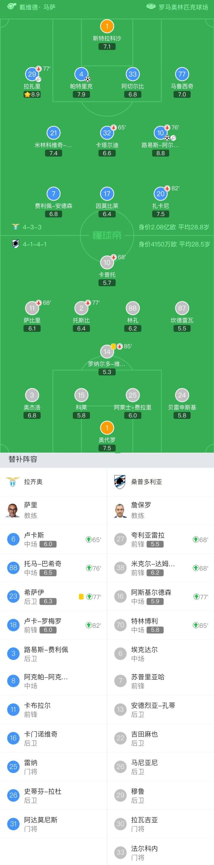 拉齐奥首发:1-斯特拉科沙、77-马鲁西奇、33-阿切尔比、4-帕特里克、29-拉扎里、10-路易斯-阿尔贝托、32-卡塔尔迪、21-米林科维奇-萨维奇、20-扎卡尼、17-因莫比莱、7-费利佩-安德森